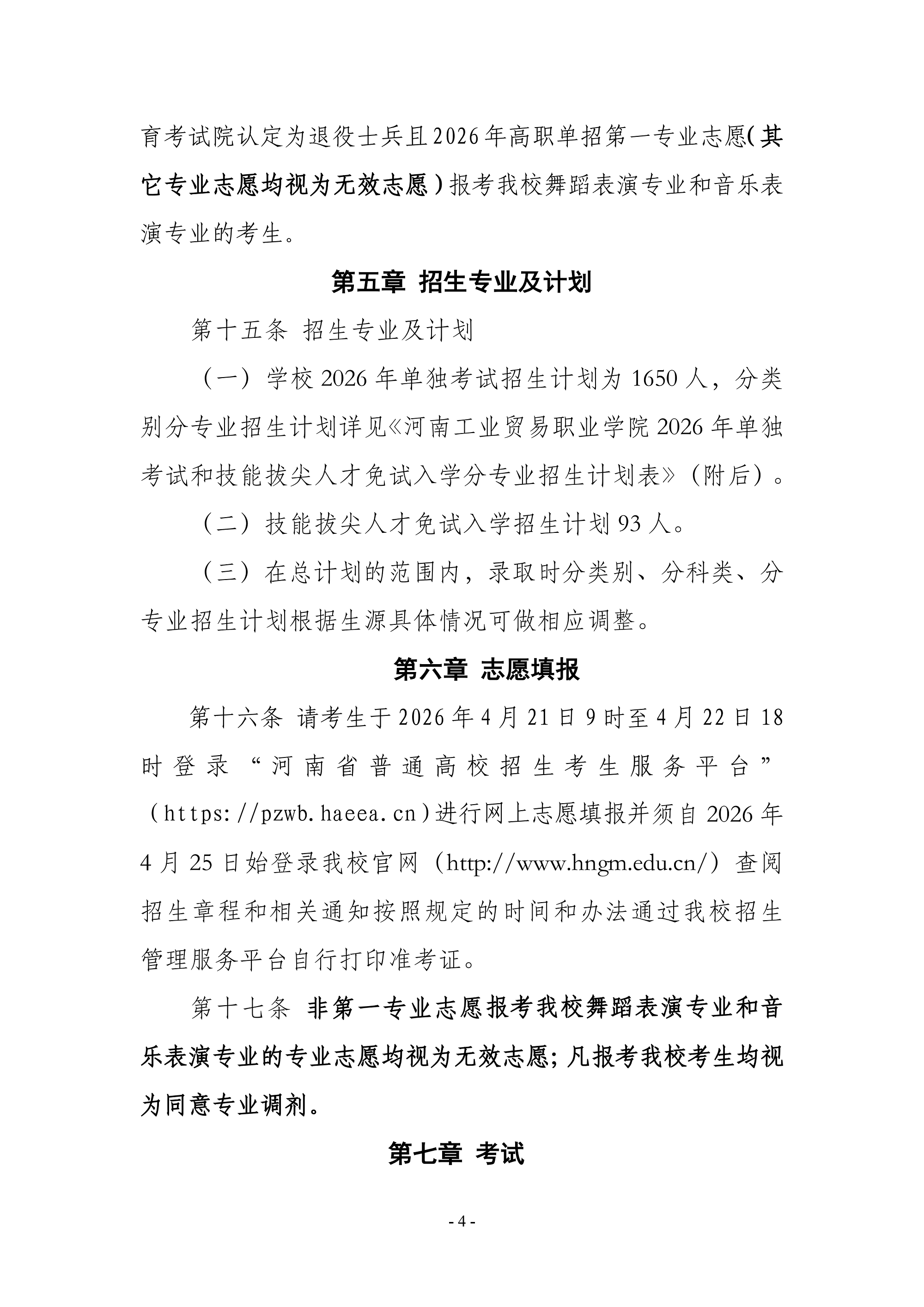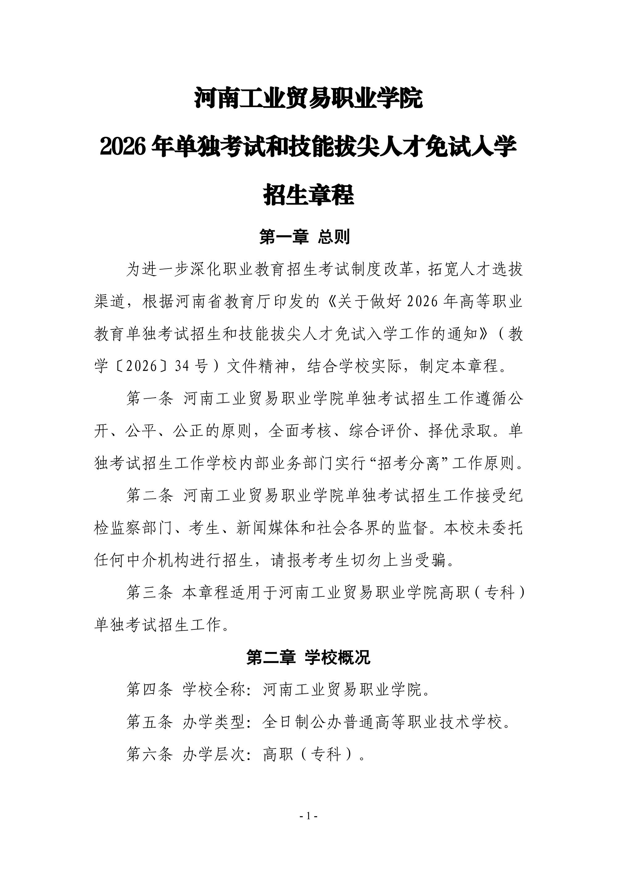 河南工业贸易职业学院2026年单独考试和技能拔尖人才免试入学招生章程